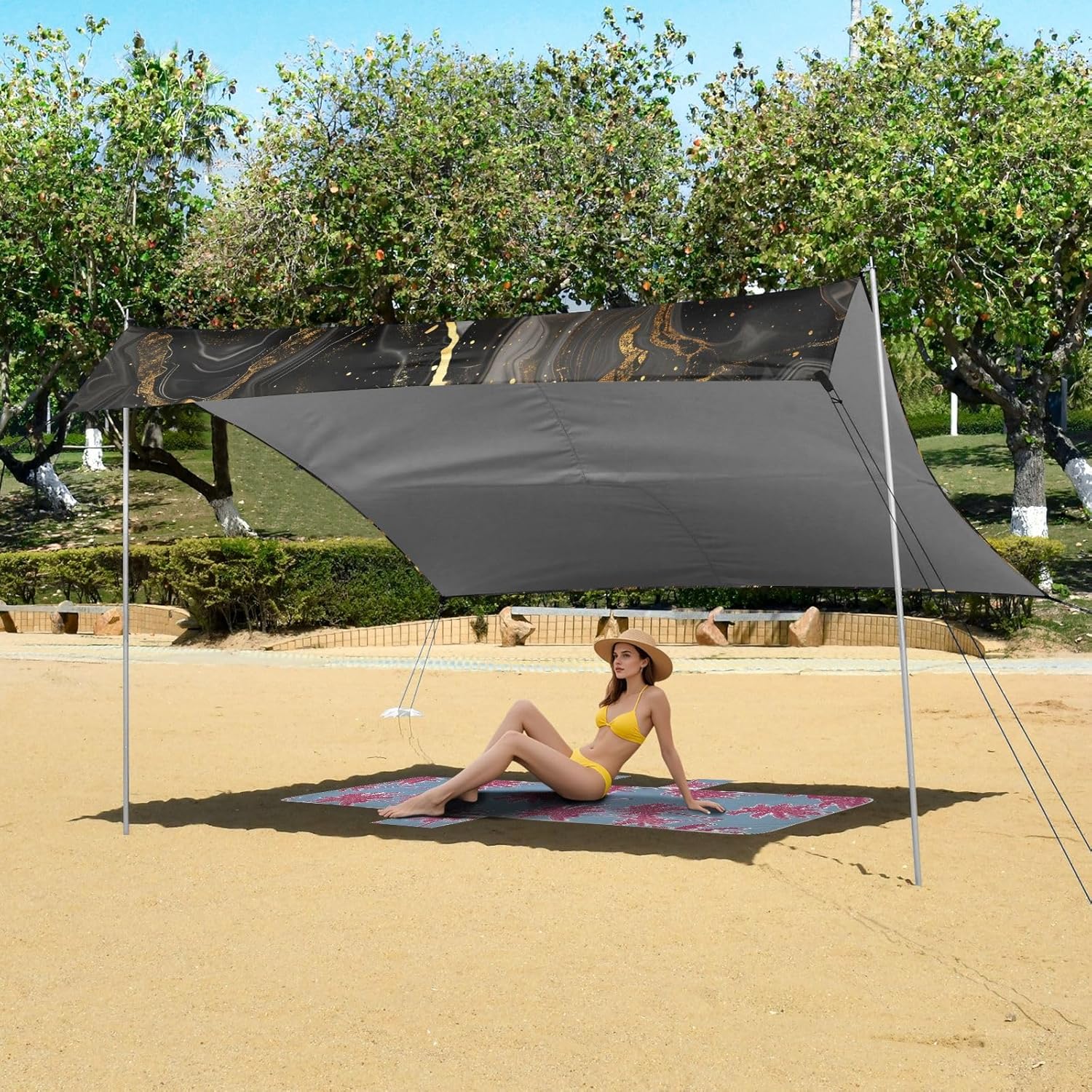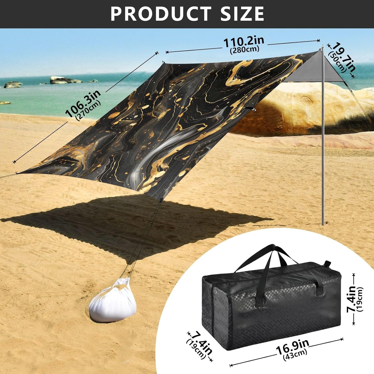 [ Material Description ]: Polyester (Silver-coated Oxford Cloth) [ Size Description ]: Canopy: 280*320cm / 110.2*126in Aluminum Alloy Metal Pole: 200cm / 78.7in Storage Bag: 19*19*43cm [ Product Description ]: This canopy is made of silver-coated Oxford cloth, which can provide effective heat insulation protection and reduce sunburn or glare. This beach tent contains a canopy, 4 windproof ropes, 4 claw nails, 4 sandbags and 1 sand shovel. In addition, our beach tent comes with a travel bag for easy storage and carrying. During the installation process, in addition to using 4 refillable sandbags and metal poles for fixing, each beach awning can add additional windproof ropes on the reinforcement poles to make the beach sunshade have better windproof performance, making this beach tent more stable, so that you don’t have to worry about the beach tent being blown away when you play. [ Applicable Scenes ]: Suitable for beaches, and also suitable for various outdoor scenes such as fishing, park outings, camping, etc. [ Washing Instructions ]: It is recommended to hand wash and wipe. Wash in warm water below 40℃. Do not use detergents such as bleach.
